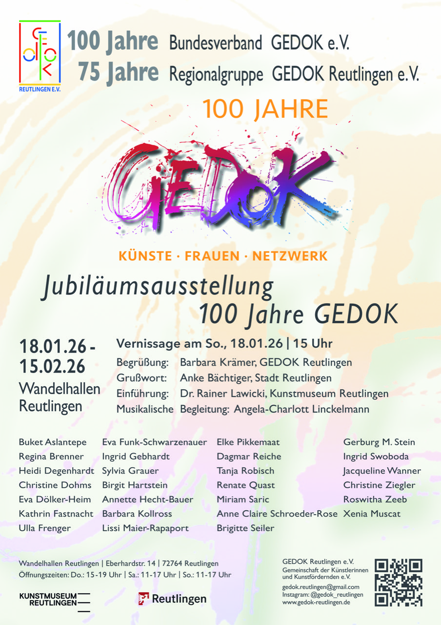 Jubiläumsausstellung GEDOK Reutlingen „Frauen-Künste-Netzwerk“ Wandel-Hallen, Galerie (Untergeschoss) Eberhardstr. 14 72764 Reutlingen Flyer |